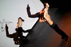 The project is based on Andrea Bianconi’s book ROMANCE. The projected moving visual text is a blend of construction and deconstruction, of closing and opening, of intimacy and extroversion: an endless chain of associated signs, reflecting thoughts projected on moving bodies